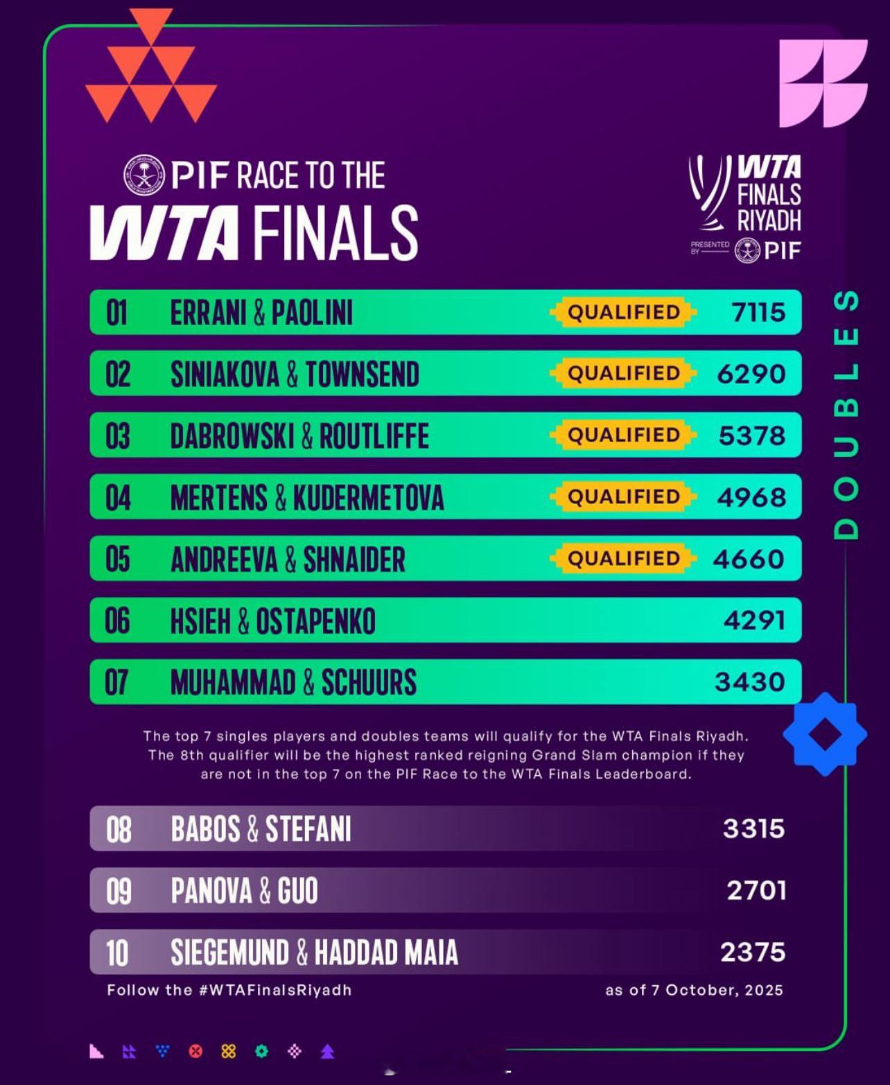 有人关注双打年终总决赛席位吗?🇨🇳郭涵煜/帕诺娃即时冠军排名No.9前五已经
