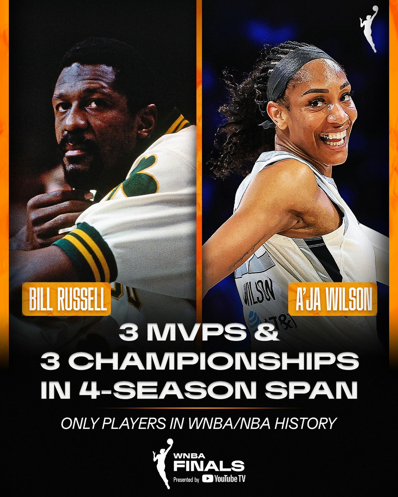 WNBA官方分享数据:阿贾-威尔逊与比尔-拉塞尔成为WNBA或NBA历史上仅有的两位在4个赛季内赢得3次MVP和3次总冠军的球员!
