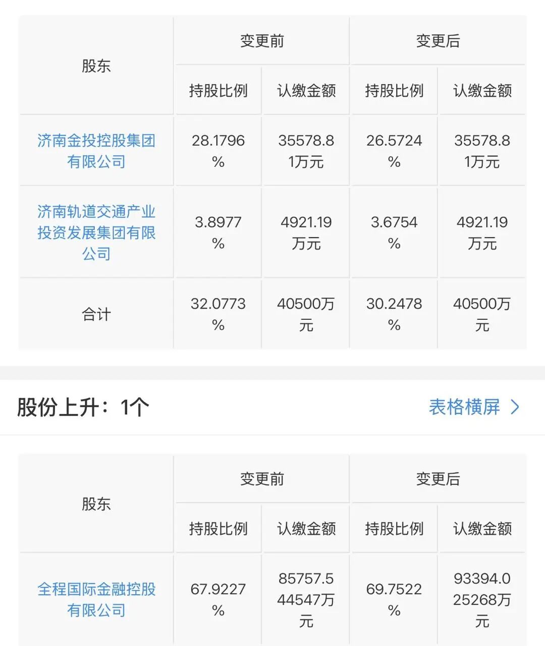 当天,济南金控租赁股东股份发生了变更,其中,大股东全程国际金融控股有限公司持股比例由67.9227%增加到69.7522%,济南金控控股集团有限公司持股比例由28.1796%下降为26.5724%;济南轨道交通产业投资发展集团有限公司持股比例由3.8977%下降为3.6754%。
