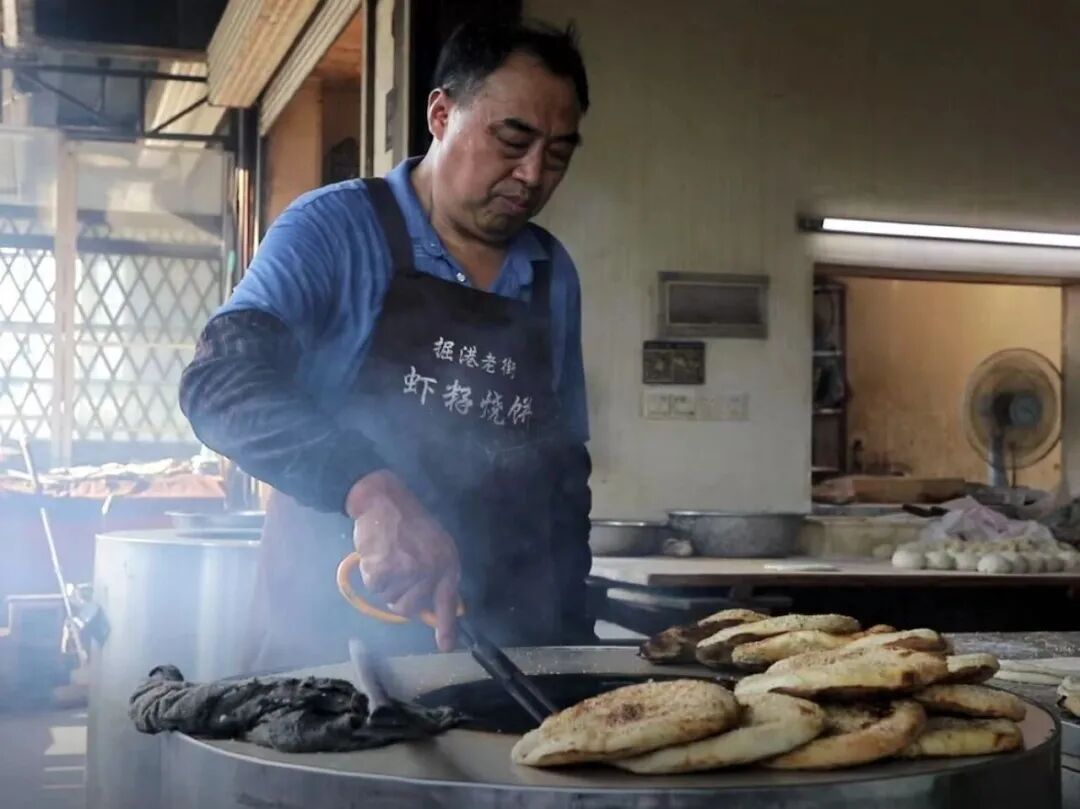 再来说说虾籽烧饼。如东店家做虾籽烧饼由来已久,但过去虾籽放得少,一些老饕自行携带,算是加料。印象中很少有人带虾籽,带猪油渣的倒是有的。如东本县掘港、岔河、栟茶、双甸、丰利等地常有人在网上说本镇的烧饼好吃,其实放眼全县乃至南通地区,烧饼制作因是同源,时间长了略有差异。如东烧饼加上虾籽,故烧饼有一种独特的鲜香,为烧饼增加了品类。如东菜是淮扬的底子加上海鲜的原料,可视作“开拓创新”,形成了如东本帮菜。现在如东虾籽烧饼“大红大紫”,本地的弹琴路书儿烧饼、东节制闸老街烧饼、栟茶一柱楼烧饼等都常常排起长长的队伍,抖音、快手上时有曝光。俗话说“回炉的烧饼不香”,要现做现吃,引得很多外地朋友慕名而来,一些在外地的如东人回家,必要带些虾籽烧饼,也算聊慰乡愁!