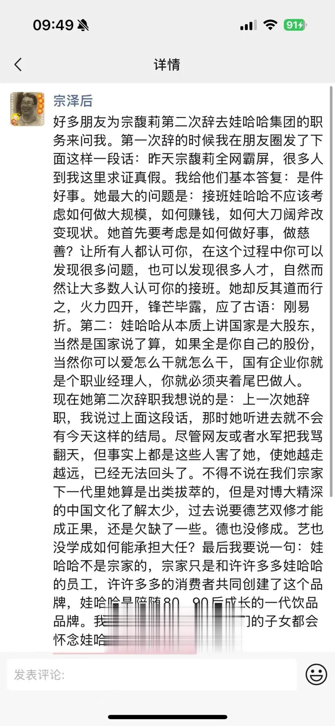 据第一财经,10月11日,宗馥莉的叔叔宗泽后在朋友圈表示:“好多朋友为宗馥莉第二次辞去娃哈哈集团的职务来问我。第一次辞的时候我在朋友圈发了下面这样一段话:昨天宗馥莉全网霸屏,很多人到我这里求证真假。我给他们基本答复:是件好事。她最大的问题是:接班娃哈哈不应该考虑如何做大规模,如何赚钱,如何大刀阔斧改变现状。她首先要考虑是如何做好事,做慈善。让所有人都认可你,在这个过程中你可以发现很多问题,也可以发现很多人才,自然而然让大多数人认可你的接班。她却反其道而行之,火力四开,锋芒毕露,应了古语:刚易折。第二:娃哈哈从本质上讲国家是大股东,当然是国家说了算,如果全是你自己的股份,当然你可以爱怎么干就怎么干,国有企业你就是个职业经理人,你就必须夹着尾巴做人。”