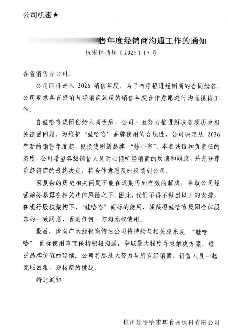 此前,杭州娃哈哈宏辉食品饮料有限公司“关于开展2026销售年度经销商沟通工作的通知”的一份内部文件流出,其中提到,“自娃哈哈集团创始人离世后,公司一直努力推进解决各项历史相关遗留问题。”为维护“娃哈哈”品牌使用的合规性,公司决定从2026年新的销售年度起,更换使用新品牌“娃小宗”。