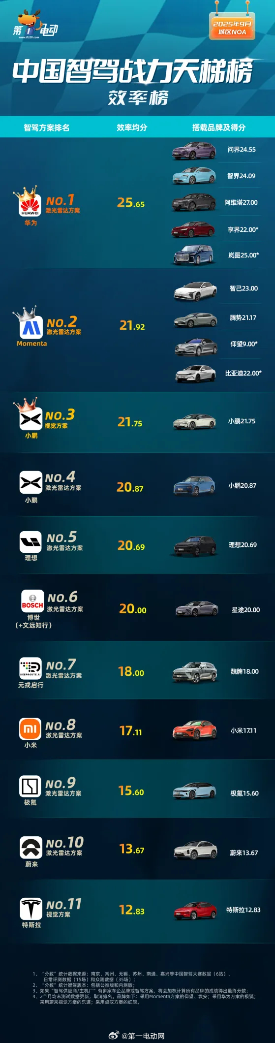 中国智驾战力天梯榜 【9月效率榜|华为跃居第一,小鹏双方案均现下滑】效率榜见证格