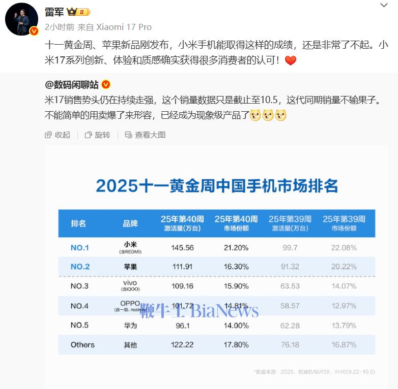 雷军表示,“十一黄金周、苹果新品刚发布,小米手机能取得这样的成绩,还是非常了不起。小米17系列创新、体验和质感确实获得很多消费者的认可!”