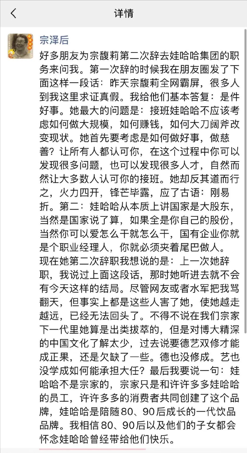 宗馥莉辞职后,10月11日,宗馥莉的叔叔宗泽后在朋友圈宣称,好多朋友为宗馥莉第二次辞去娃哈哈的职务来问他。上一次辞职时,他说过一段话,那时宗馥莉听进去就不会有今天这样的结局。“尽管网友或者水军把我骂翻天,但事实上都是这些人害了她,使她越走越远,已经无法回头了。”