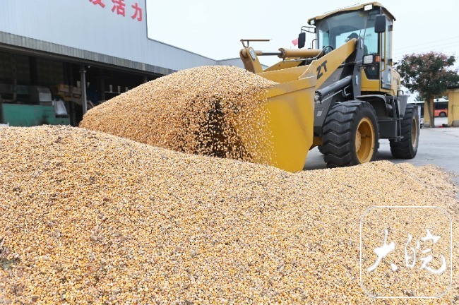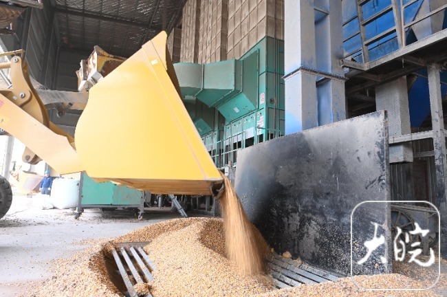 在亳州市谯城区大杨镇聂红伟种植专业合作社(粮食烘干点),工人正操作铲车将潮湿的玉米粒投进粮食烘干机。