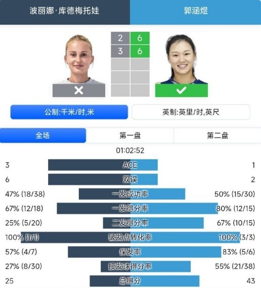 直播吧10月11日讯WTA宁波网球公开赛资格赛首轮战罢,中国选手郭涵宇2-0击败库德梅托娃,决胜轮将战拉克西莫娃。杨一迪2-0轻取郑赛赛,将和森梅兹争夺正赛门票。渠依含、陈梦钇不敌对手遭到淘汰。