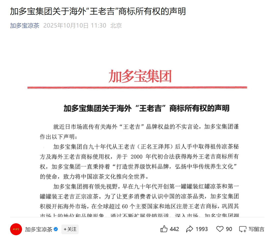 该声明谈及,“王老吉”品牌起源于清代道光年间,现“王老吉”商标的所有人为广州白云山医药集团股份有限公司,“王老吉”品牌的历史沿革资料、知识产权权属的法律文件均完整清晰。截至2025年9月30日,“王老吉”品牌权利人广州白云山医药集团股份有限公司、广州王老吉大健康产业有限公司已在全球100多个国家和地区完成“王老吉”“WALOVI”等系列商标注册工作,商标权利明确,法律保护完备。