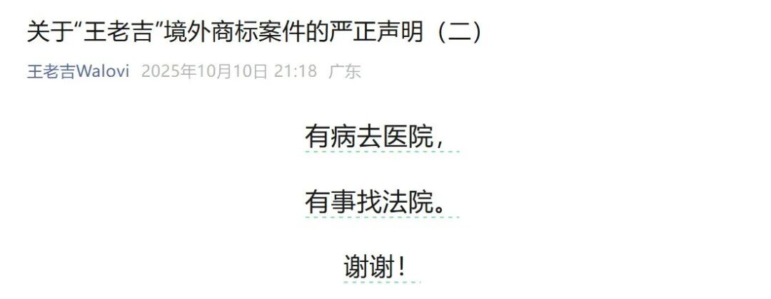 “王老吉Walovi”则于9月30日晚间发布《关于“王老吉”境外商标案件的严正声明》进行回应。