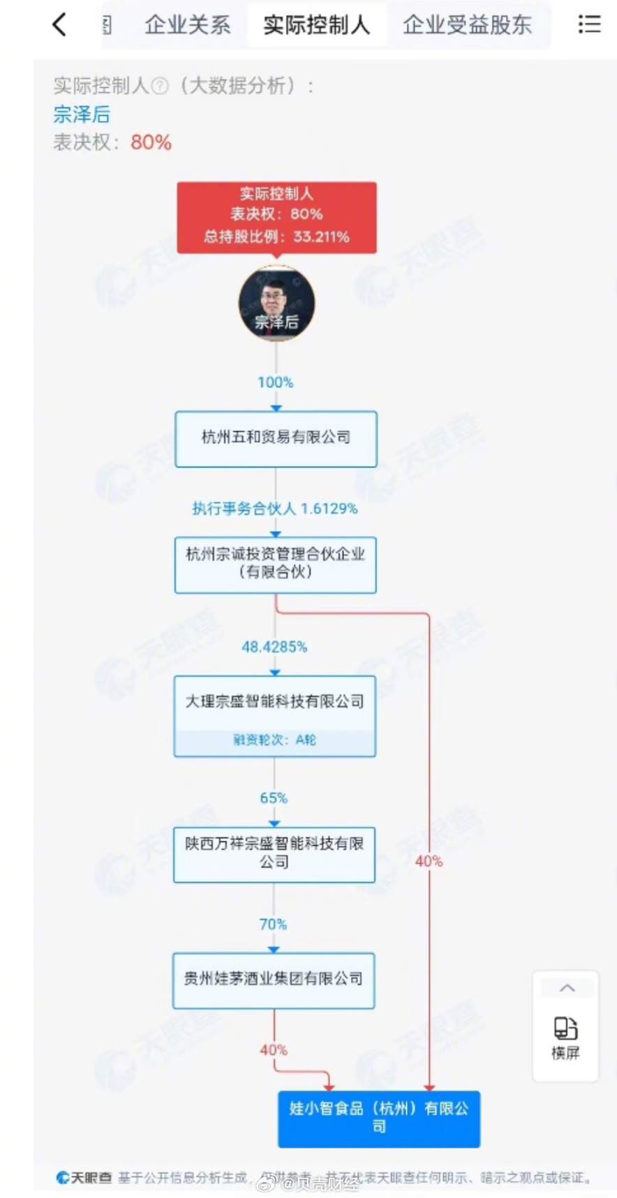 天眼查APP显示,娃小智食品(杭州)有限公司成立于今年1月13日,股东为贵州娃茅酒业集团有限公司、杭州宗诚投资管理合伙企业(有限合伙)、杭州星光城市发展集团有限公司,持股比例分别为40%、40%、20%。经过股权穿透,娃小智食品(杭州)有限公司的实际控制人为宗泽后。