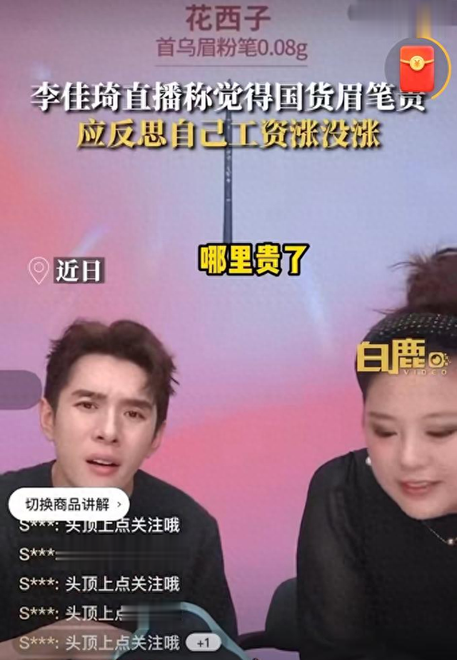 2023年9月10日,头部主播李佳琦在直播间带货“花西子”产品,推介一款79.9元的眉笔时,有网友评论“花西子眉笔越来越贵了”。李佳琦当即回应“哪里贵了,国货很难的”,并提醒消费者要从自己身上找原因,“这么多年工资涨没涨,有没有认真工作”。