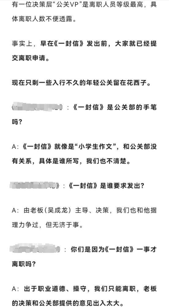 封面新闻记者注意到,这篇对话体文章目前仍然留存在网络。其中,接受采访的离职公关人员还称:《一封信》发出前我们尝试说服老板,但老板意志无法违逆,最终没拦住,毕竟品牌、公司都是他的。