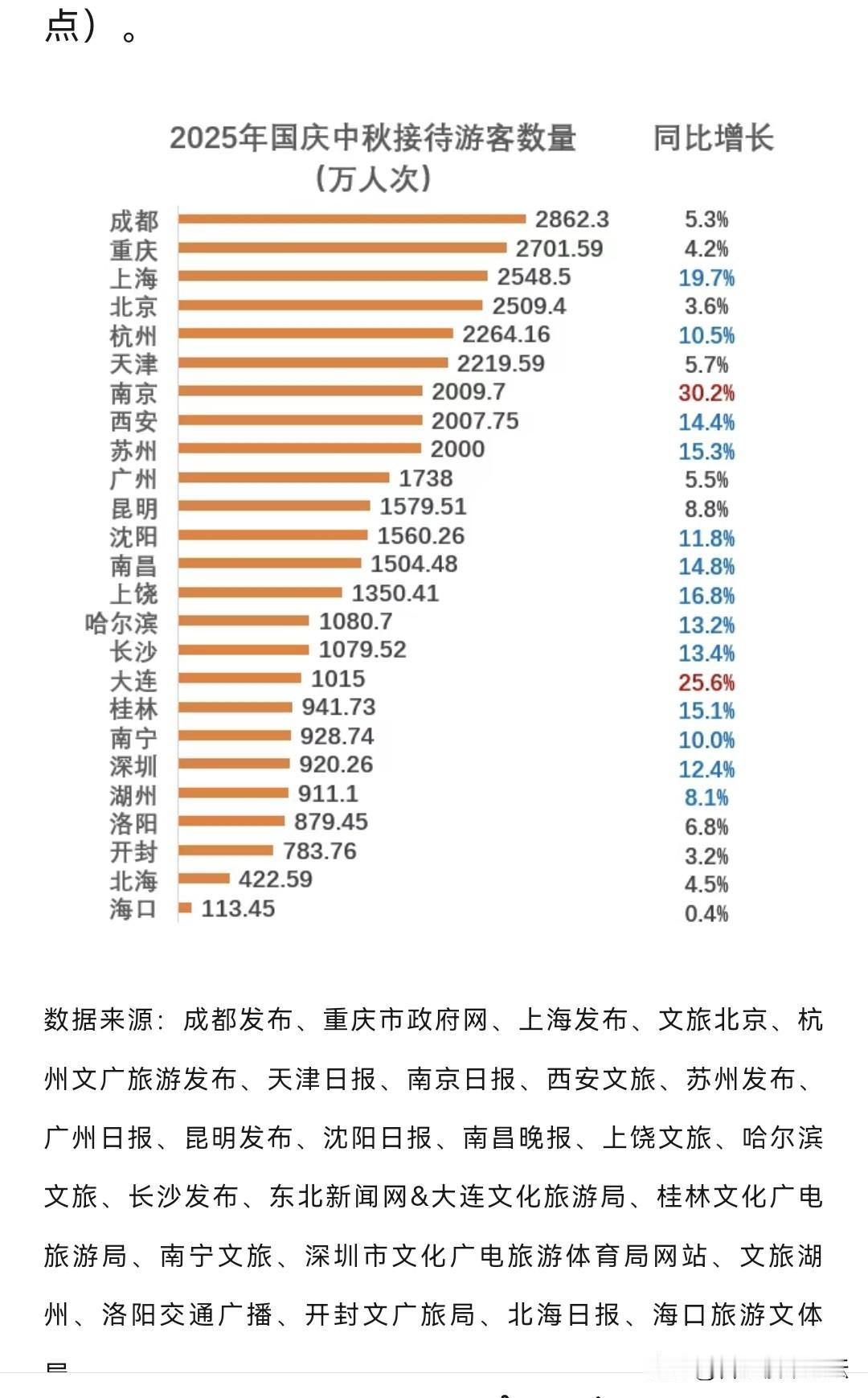2025年中秋国庆双节应该是哪都堵,现在有统计各地文旅局发布的接待游客数量来了。其中成都排在第一,重庆排在第二,上海排在第三。 就是都是在说大环境咋样咋样,但是现在旅游的其实比之前要多很多。可能真的都是想开了,看透了。比如以前在合肥很明显很多人张口闭口就是房子,现在都吃亏了,一下就感觉把这个东西看的透透的了。