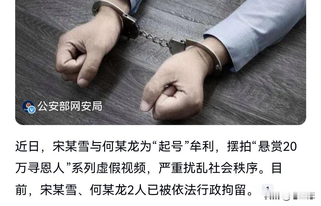 这真是大快人心啊!终于让无良博主得到了应有的惩罚。 此前有一个女人悬赏20万寻恩人。 没想到这个事情是炒作,是虚假摆拍,欺骗全中国的人。 10月12日看到这么个消息,2人摆拍悬赏20万寻恩人被拘。 拘得非常的好,应该把这个人的账号永久封禁。