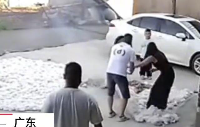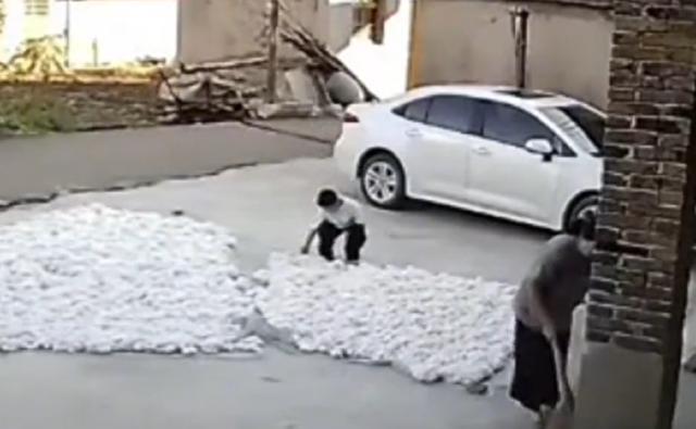 广东,一户农家,爷爷奶奶把家里丰收的棉花,平铺到门口晾晒,铺好之后,奶奶拿来扫帚