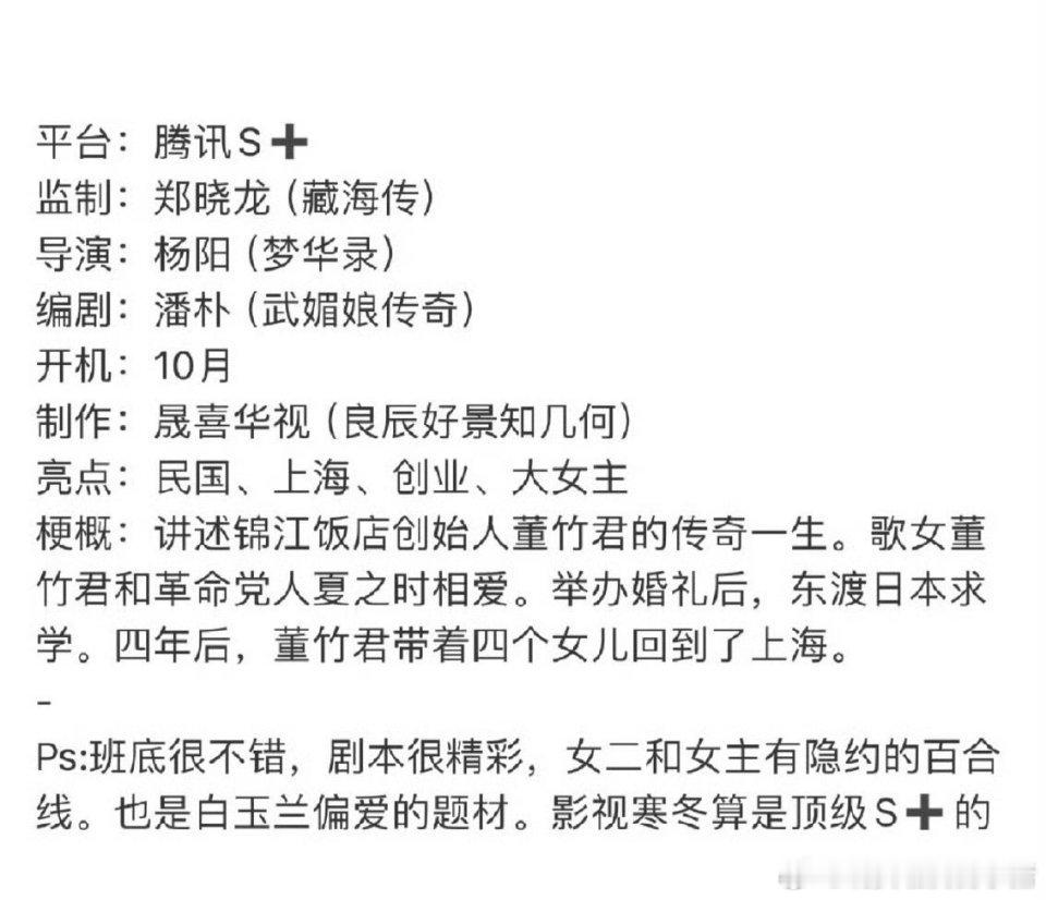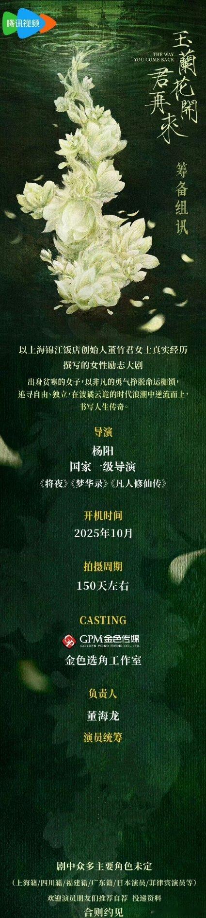 玉兰花开君再来女主已经定了杨紫,男主 85 年左右,实力派演员,11 月左右开机