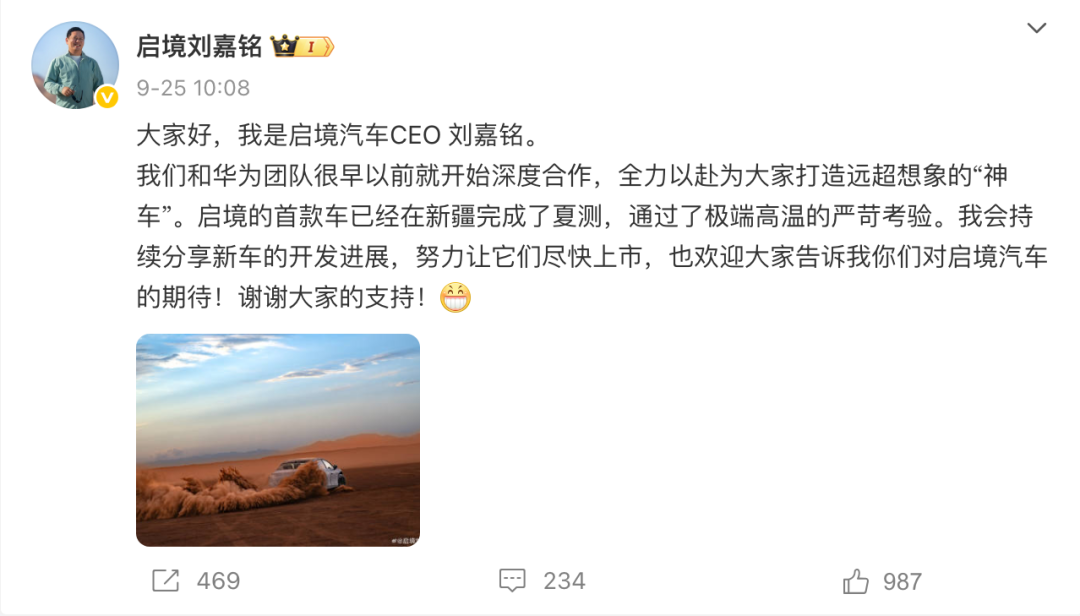 不出意外的话,DH品牌将是第二个以“X境”命名的品牌。今年9月,由广汽与华为联合打造的“启境”品牌官宣,定位为高端智能新能源汽车品牌,刘嘉铭担任启境汽车CEO。根据双方的规划,启境汽车将全系搭载华为乾崑的智能技术。