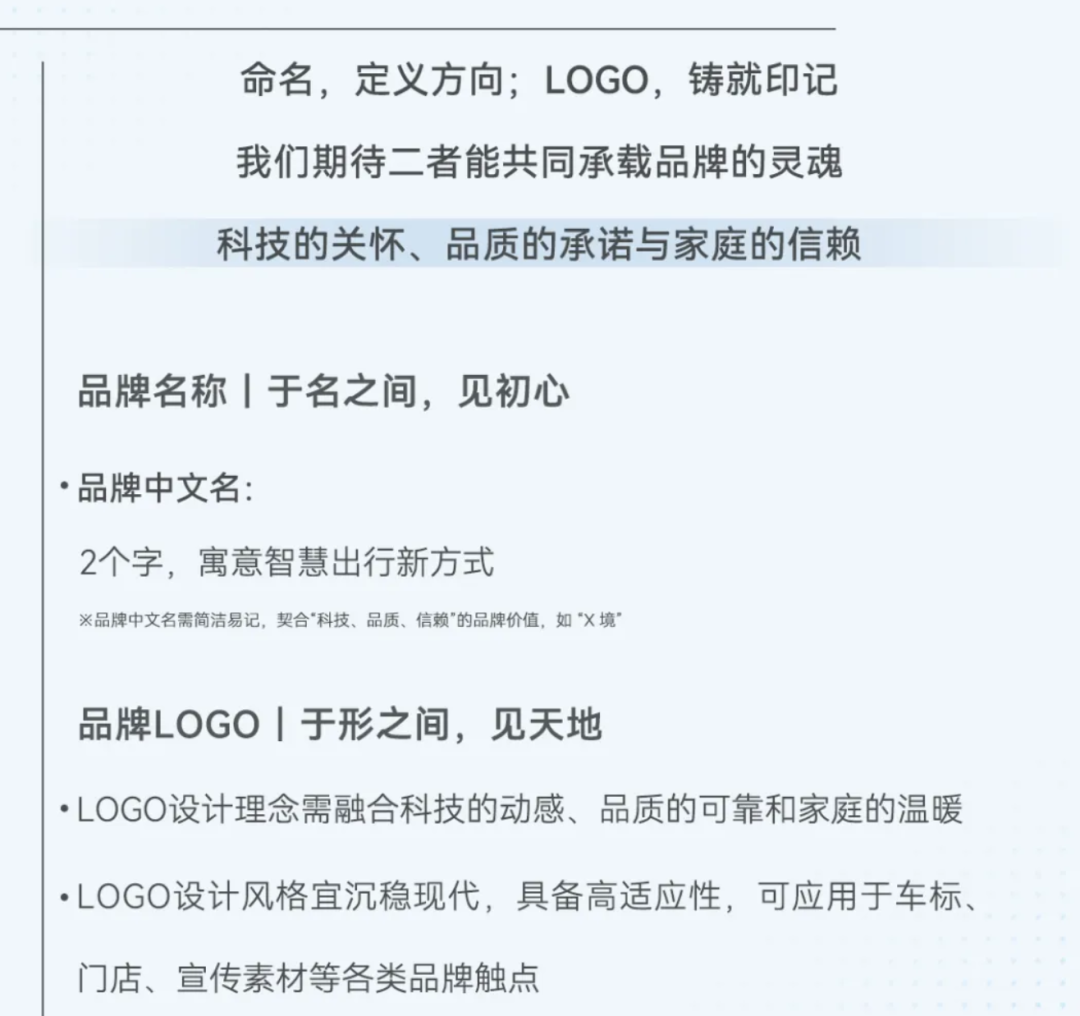根据征集活动要求与流程,品牌名称需“于名之间,见初心”,具体要求为品牌中文名需为2个字,寓意智慧出行新方式,需简洁易记,契合“科技、品质、信赖”的品牌价值,并给出了如“X境”的参考范式。品牌LOGO需“于形之间,见天地”,设计理念需融合科技的动感、品质的可靠和家庭的温暖,设计风格宜沉稳现代,具备高适应性,可用于车标、门店、宣传素材等各类品牌触点。