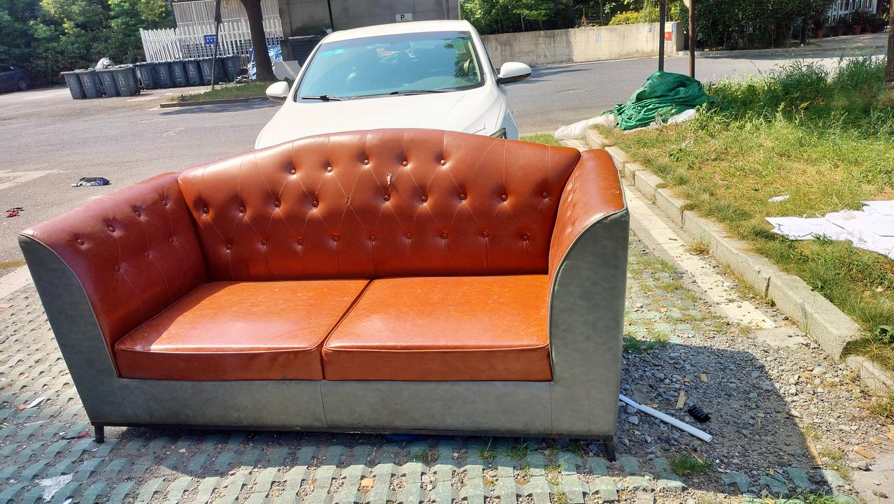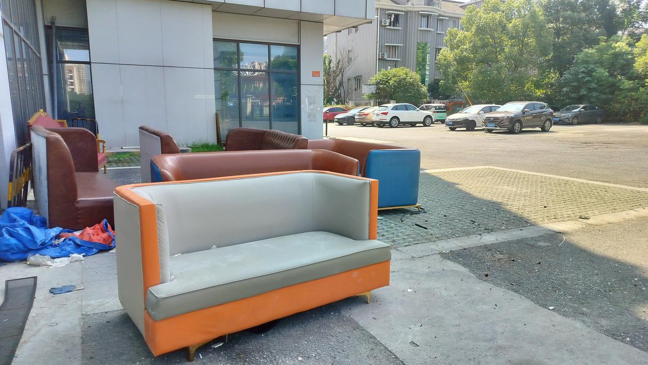 这些沙发丢在角落里,得出千把块叫人当垃圾拖走,小区最便宜的房子也要360万,小区的业主丢废品的也多,捡废品的也多。