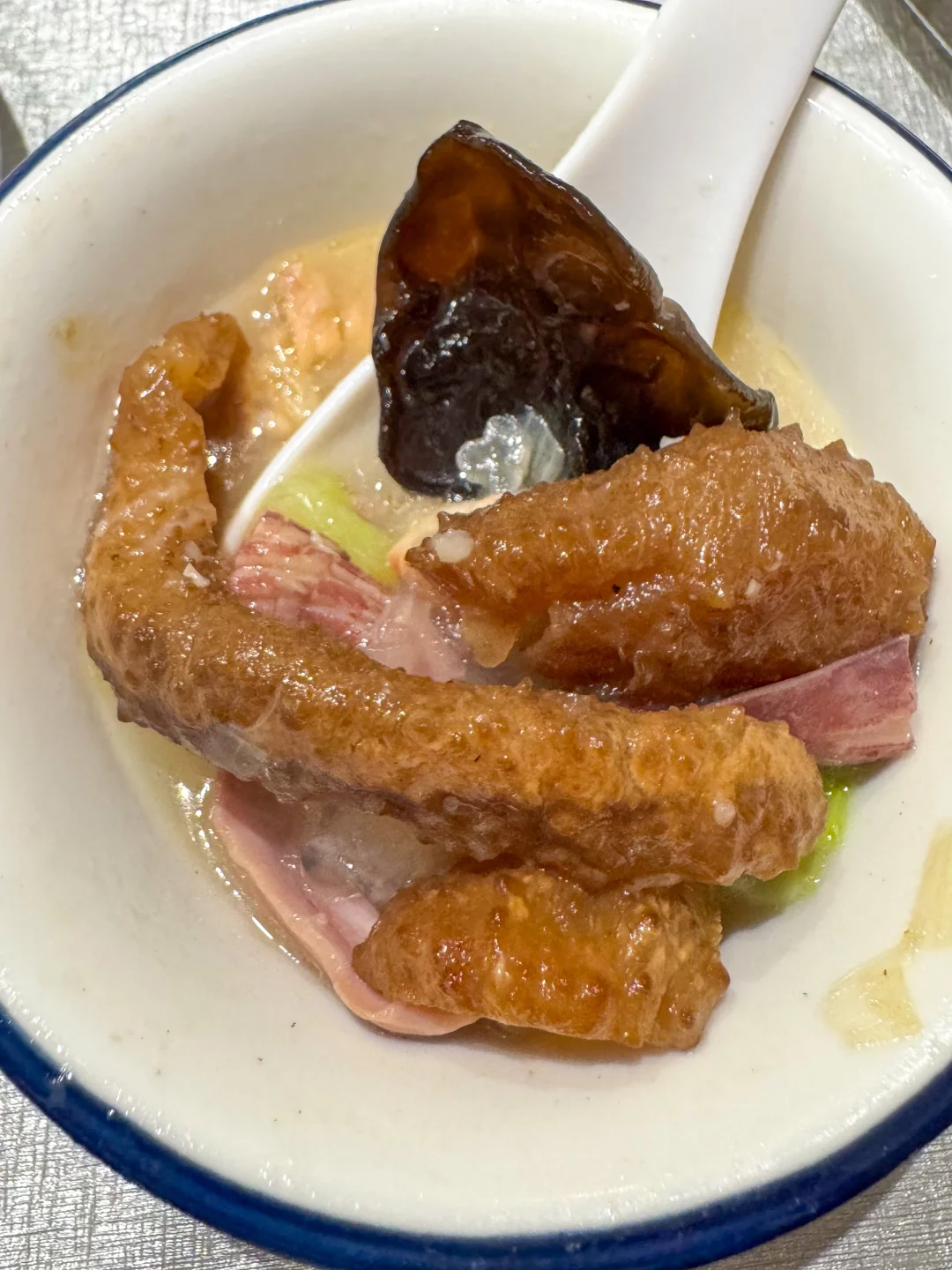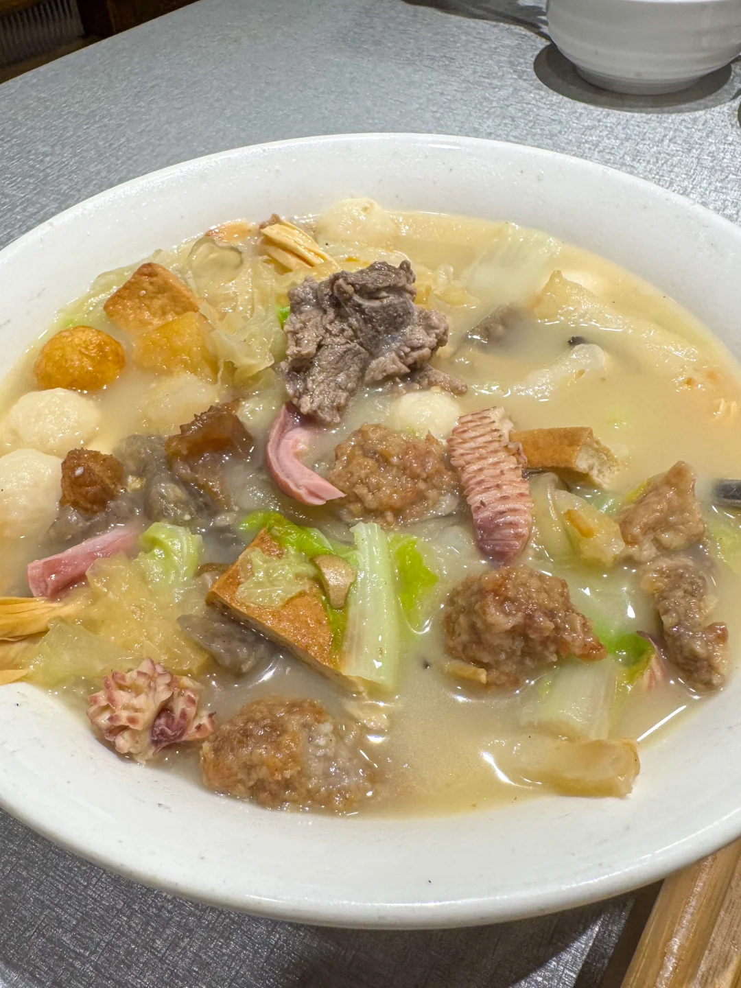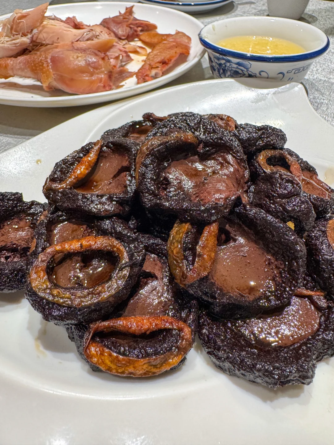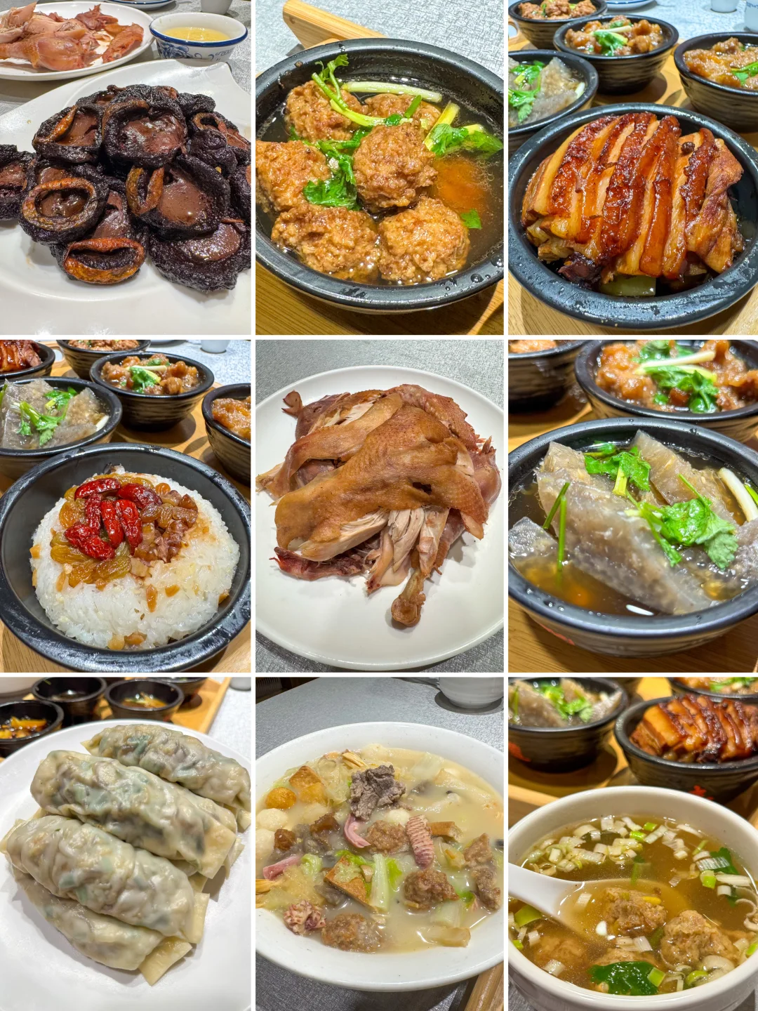 →点的小份,但已是巨大一碗。有点像把扣碗拼盘里面的肉制品重新集合在锅里,加入海参和鱿鱼快重新炖一锅~