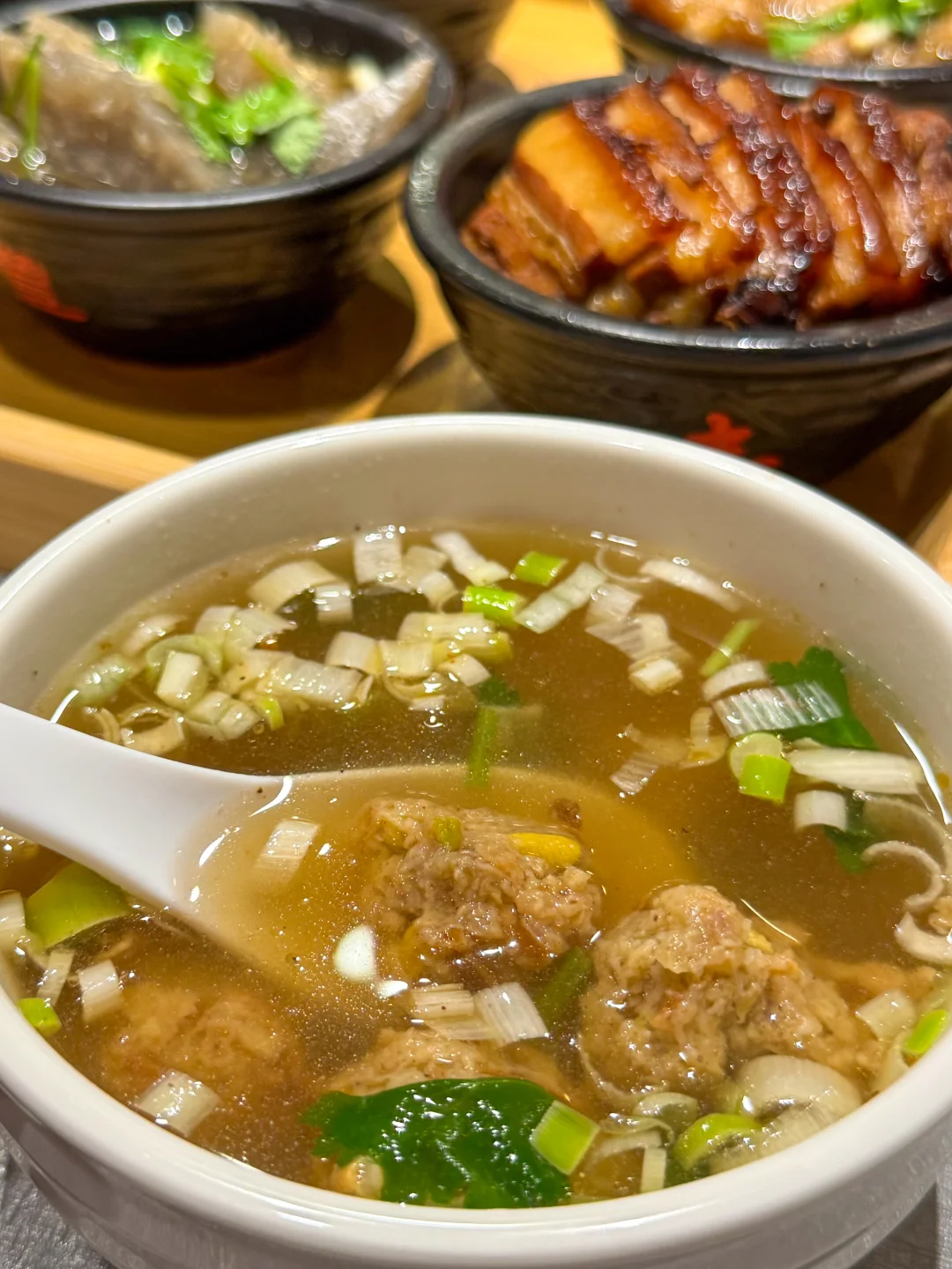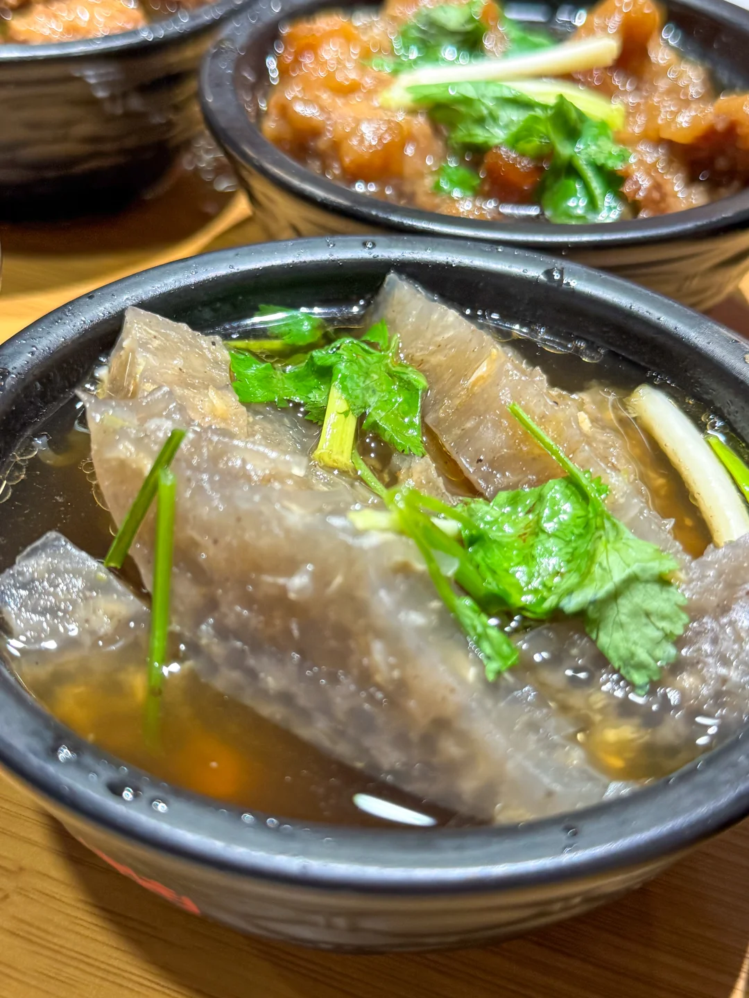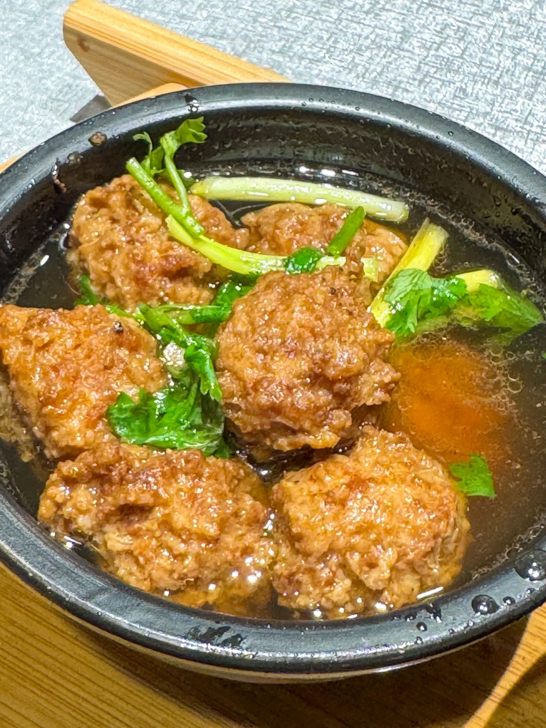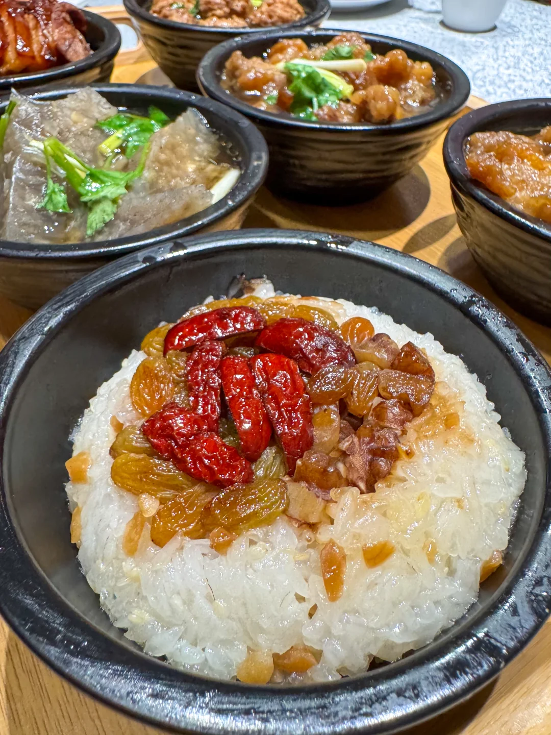 →点的小份,但已是巨大一碗。有点像把扣碗拼盘里面的肉制品重新集合在锅里,加入海参和鱿鱼快重新炖一锅~