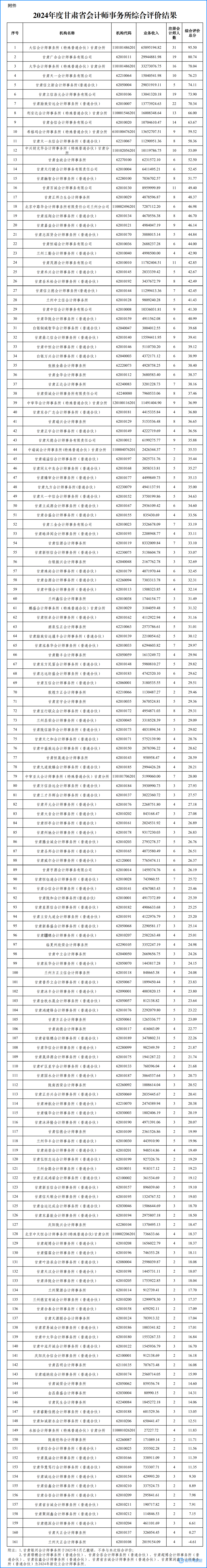 为综合反映与科学评价我省会计师事务所整体实力和专业胜任能力,推动行业信用体系建设,提升行业公信力和影响力,促进行业高质量发展,切实发挥综合评价“指挥棒”作用,按照《甘肃省会计师事务所综合评价办法(试行)》(甘会协〔2025〕22号)和《甘肃省注册会计师协会关于开展2024年度全省会计师事务所综合评价工作的通知》,依据各事务所2024年12月31日前“中国注册会计师协会行业管理信息系统”基本信息及报送资料,我们对全省会计师事务所进行了综合评价,评价结果经甘肃省注册会计师协会审核且公示无异议,现将2024年度甘肃省会计师事务所综合评价结果予以公告。
