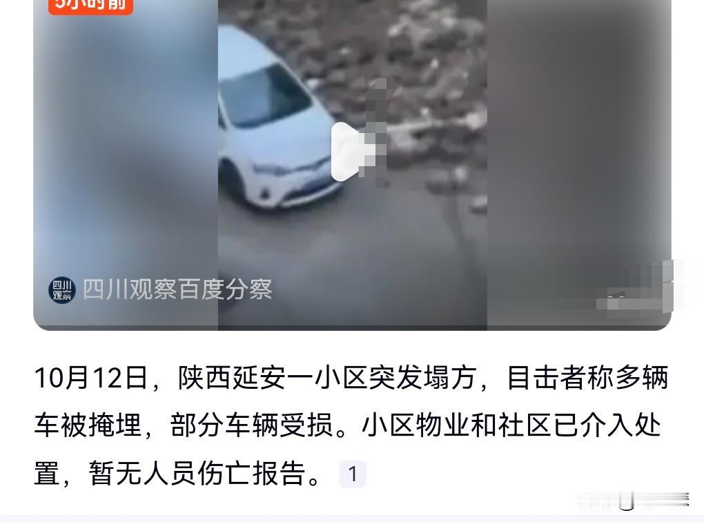 这真的是太防不胜防了,自然灾害一定要引起重视啊。 10月12日,陕西一小区突发塌方,多辆车被掩埋,这真的是太倒霉了,太耽误事了。 有一辆车平滑落地,这真是不幸中的万幸。 幸亏当时没有造成人员伤亡,要不然的话后果不堪设想。 像这样容易塌方的地方还真得种树,树实在是太重要了,这水土流失很可怕的。