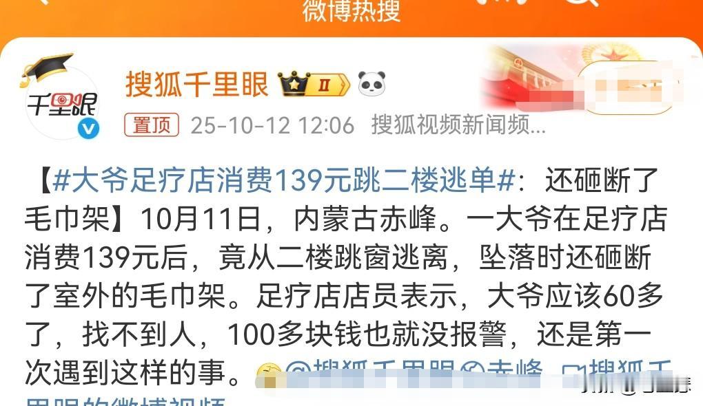 究竟是人性的泯灭,还是道德的沦丧? 竟然为了100多块钱逃单。 如果穷到这个份上了,那还去洗脚按摩干什么? 10月11日,内蒙古赤峰,大爷足疗店消费了139元,竟然想白享受,他竟然选择了从2楼跳下来逃单。 砸到了毛巾架。 这真的是太拼了。 店家也是第1次遇到,没有选择报警。 这名男子应该去搞一些有意义的活动,这种花钱的事就不要再想了。