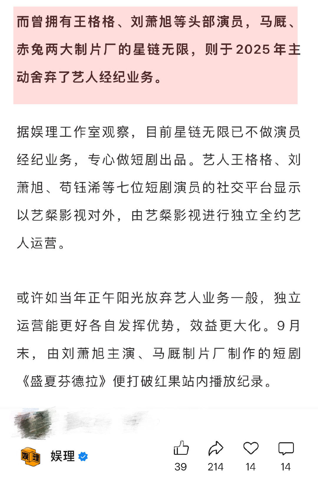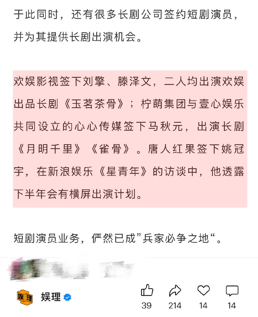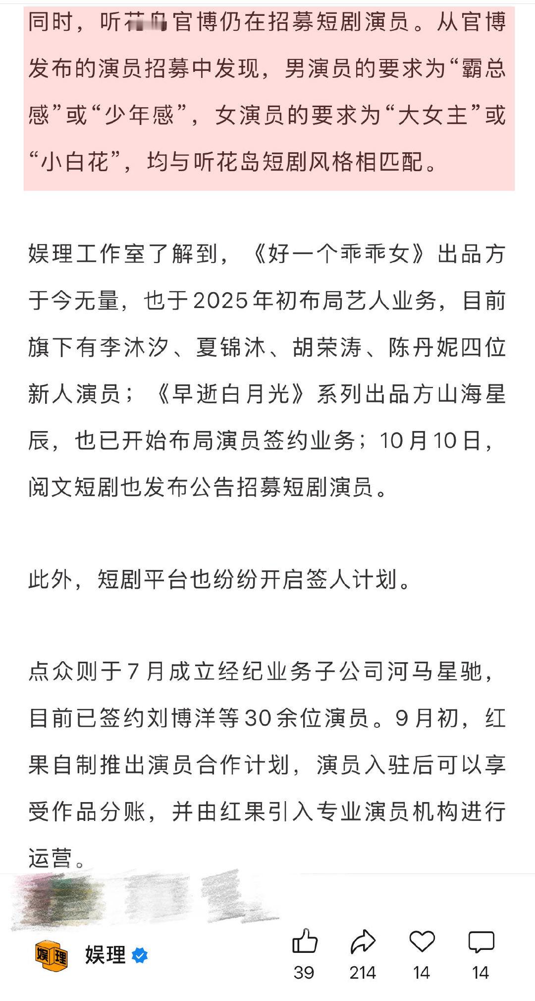 业内称短剧演员演长剧的意愿不高 短剧男演员想和刘萧旭合作 拥有头部演员最多的是短剧头部制作厂牌听花岛,目前共签约17位短剧演员,已完成自制精品剧+自家头部艺人主演、新人参演模式的闭环。听花岛官博发布的演员招募中,男演员的要求为“霸总感”或“少年感”,女演员的要求为“大女主”或“小白花”,均与其短剧风格相匹配…娱理独家↓