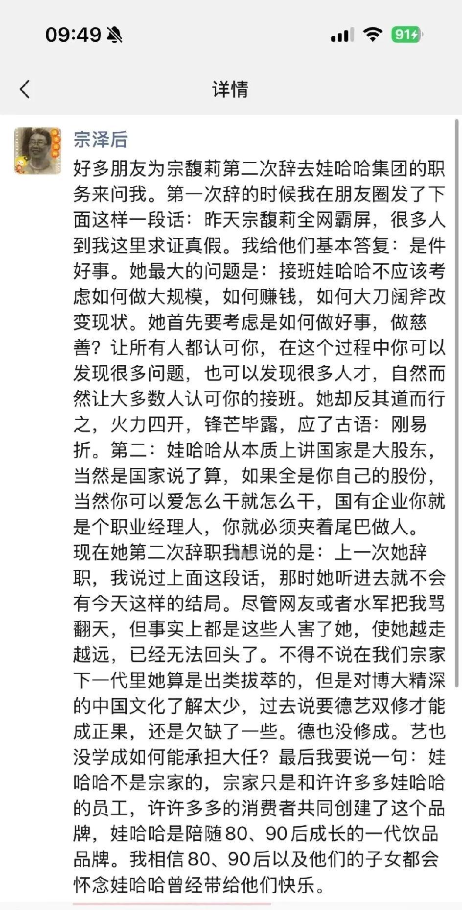 宗馥莉的亲叔叔咋像个婆娘?侄女遇到困难不帮忙也就算了。还不断地落井下石。 一会说宗馥莉艺没学好,德也没学好;一会说宗馥莉被水军害了;一会说她应该做慈善。 宗馥莉给新产品起名娃小宗,他叔叔就立即新创了娃小智,并且签约了100家供应商。 这叔叔不但说话难听,而且做事绝。 第一时间跟侄女抢占市场。精神上嘲讽恶心侄女,经济上断她钱财掘她后路。 他这个亲叔叔还是个碰瓷专家。 生产过“娃茅”白酒,碰瓷茅台后被罚款30多万。去年还生产了宗师傅AD钙奶,被罚款80万。 他还好意思劝别人多做慈善,他自己1分钱没捐过。 宗泽厚一把年纪了,就没想过亲哥哥地下有知会气得掀翻棺材板吗? 这个坏叔叔真是把落井下石、趁火打劫刻进骨髓里了。