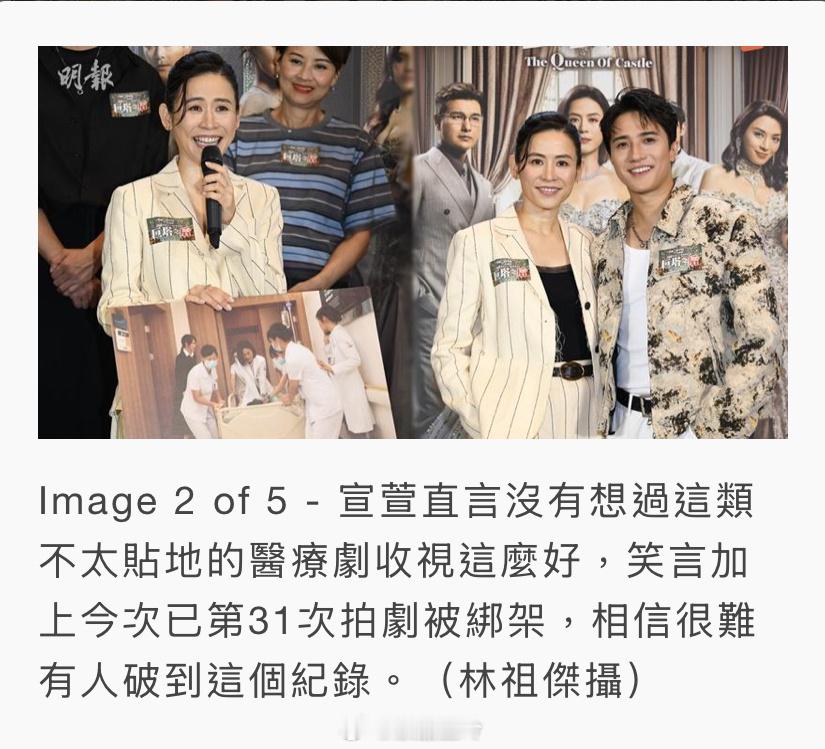 宣萱直言沒有想過這類不太貼地的醫療劇收視這麼好,笑言加上今次已第31次拍劇被綁架,相信很難有人破到這個紀錄。對於被網民選為劇中「王家」最高顏值女人第一,她則指全靠化妝師和燈光師:「燈光師出名好勁,打到連頸紋都冇,一次合作,已返唔到轉頭。」