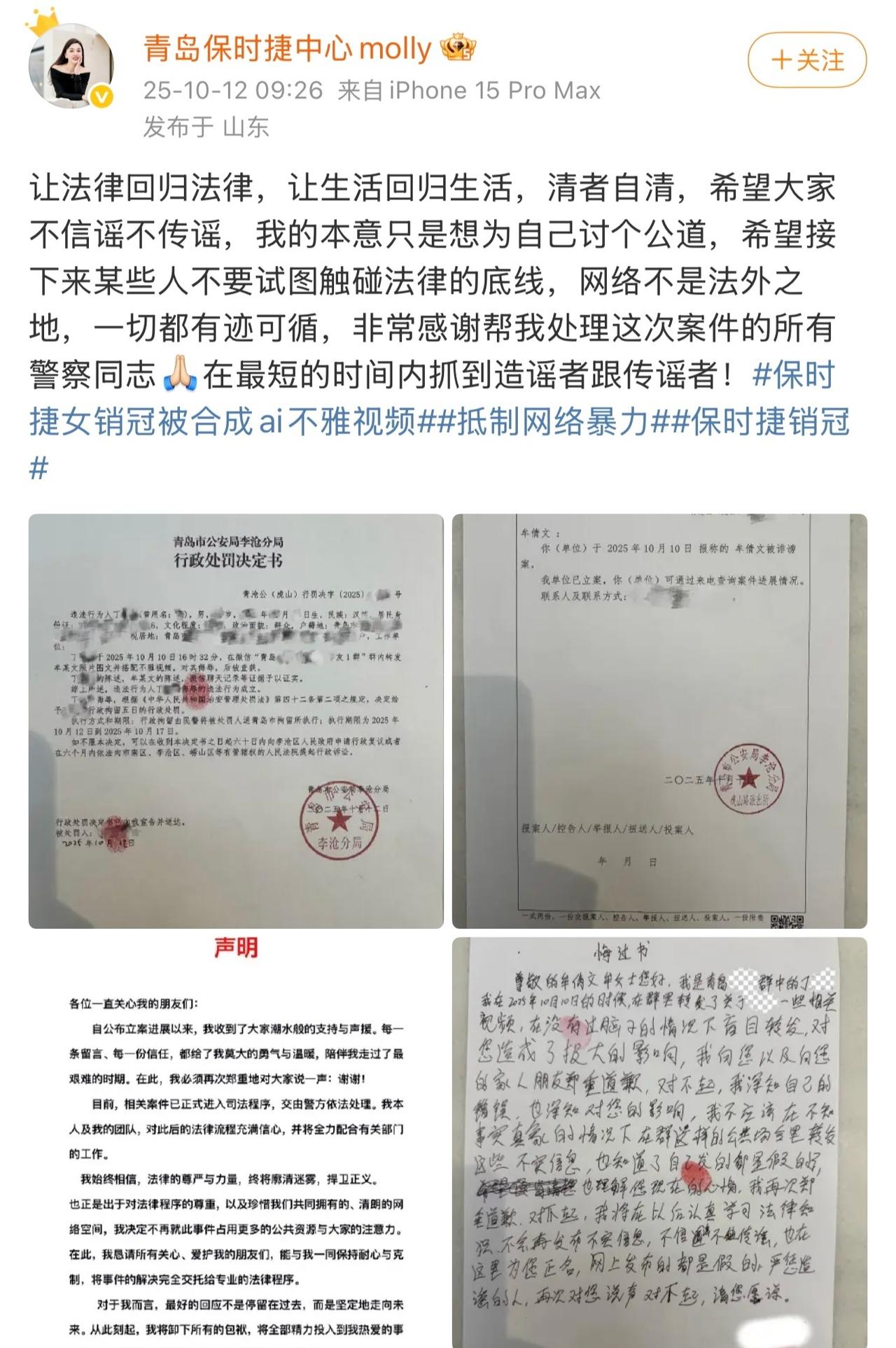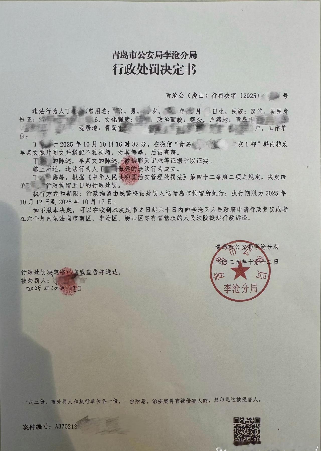 青岛保时捷女销冠牟女士,在社交平台公布了青岛市公安局李沧分局的行政处罚决定书。丁某在微信群内转发牟女士的照片并搭配AI合成的不雅视频,被行政拘留五日。