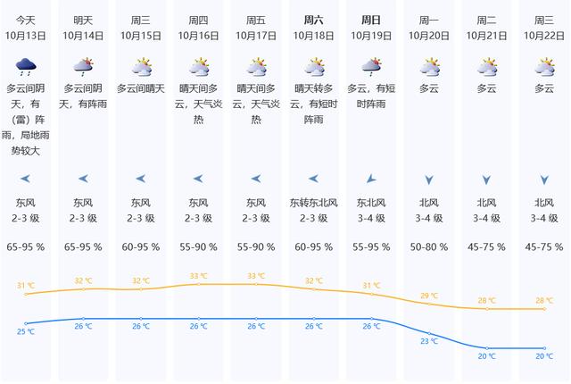 预计13-14日多云间阴天,有(雷)阵雨,局地雨势较大;
