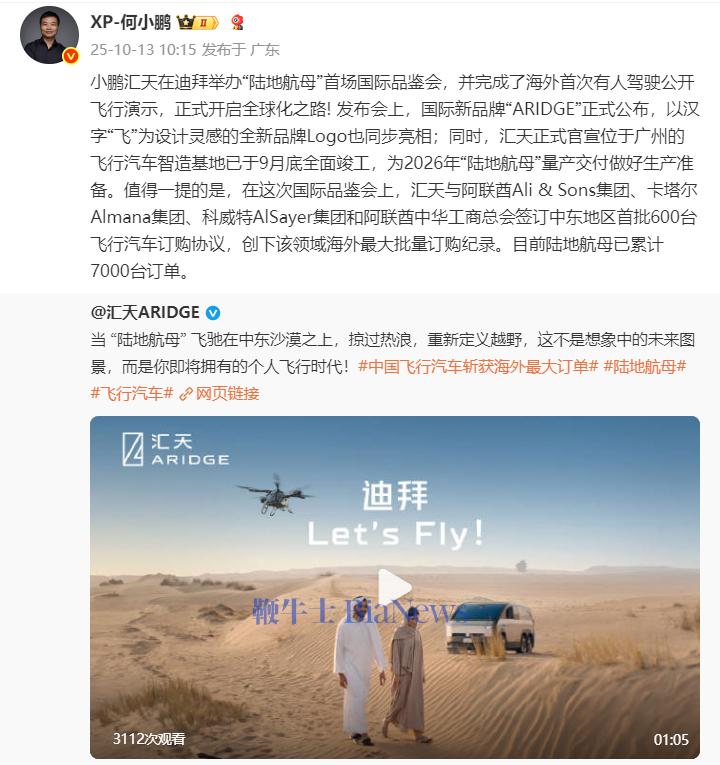 小鹏汽车创始人何小鹏今日发文表示,昨日,小鹏汇天在迪拜举办“陆地航母”首场国际品鉴会,并完成了海外首次有人驾驶公开飞行演示,正式开启全球化之路。