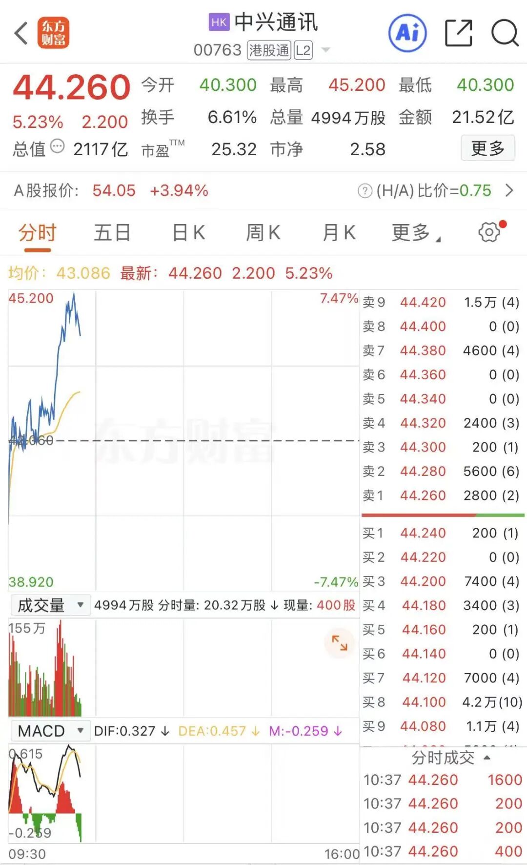 中兴通讯港股同样再创历史新高,盘中一度涨逾7%,截至发稿,最新股价报44.26港元/股,上涨5.23%。