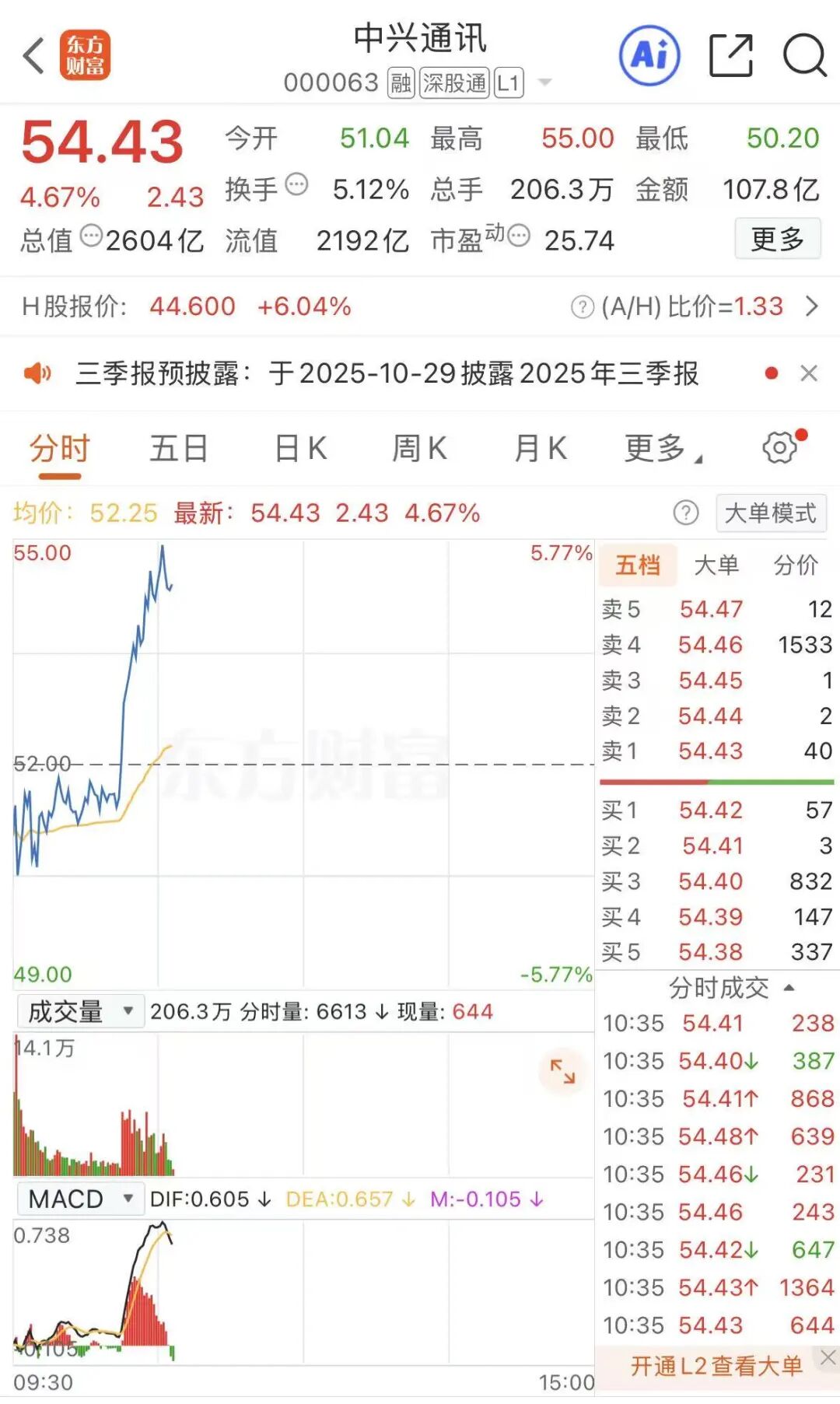 此外,13日中兴通讯A股(000063)低开后盘中大幅拉升,一度涨超5.7%,股价最高达55元/股,再创新高。截至发稿涨4.67%,报54.43元/股,总市值突破2600亿元,成交额达107.8亿元。