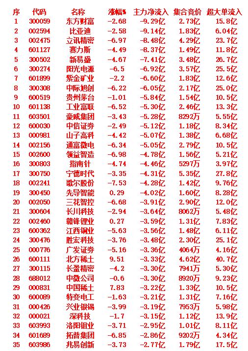 10月13日上午盘,主力趁低位,大幅买入的35名单 主力资金净流入前五名(涨幅与资金同步) 包钢股份:涨幅为9.84%,主力净流入16.4亿元。 中国软件:涨幅为10.00%,主力净流入8.34亿元。 王子新材:涨幅为9.98%,主力净流入4.77亿元。 士兰微:涨幅为6.24%,主力净流入4.10亿元。 中芯国际:涨幅为3.88%,主力净流入3.66亿元。 10月13日中午收盘,主力资金“大幅卖出”的35名单: 东方财富:主力净流出9.29亿元。 比亚迪:主力净流出9.14亿元。 立讯精密:主力净流出8.48亿元。 赛力斯:主力净流出8.37亿元。 新易盛:主力净流出7.41亿元。