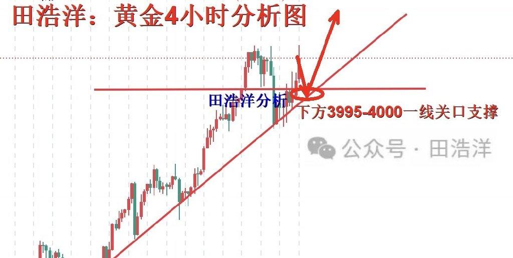 从4小时行情走势来看,目前下方关注短期支撑3995-4000一线关口支撑,重点关注3975-83一线关键支撑,多头强势上涨不言顶,操作上以回踩做多为主,中间位置一律多看少动谨慎追单,耐心等待关键点位进场。具体操作策略我会在盘中提示,及时关注。