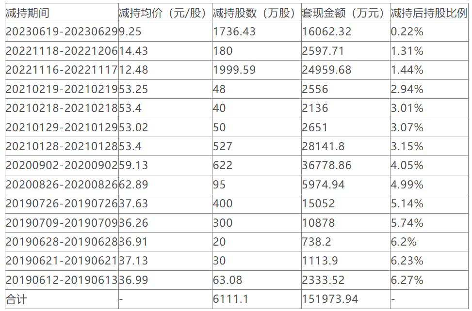 2023年6月19日至2023年6月29日,减持1736.43万股,减持套现金额为1.61亿元。本次减持过后,吴学东持股比例降至0.22%。