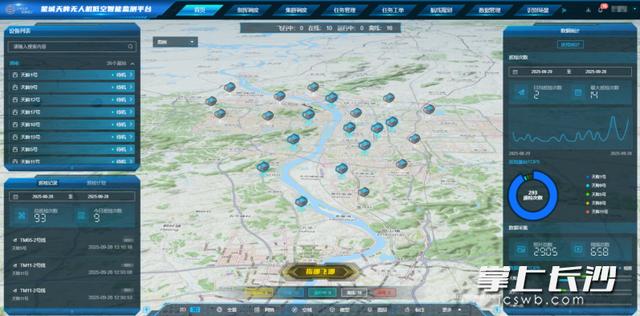 而“星城天眸”的优势,远不止于效率提升。与普通民用无人机不同,星城天眸体系部署的无人机智能机巢已全部接入智能监测平台,在城市的每一个角落24小时待命,随时可调动飞行。操作人员在电脑端轻点鼠标,即可完成航线规划、实时轨迹调整、飞行状态监控、多类数据采集等作业内容。无人机飞行时,可将拍摄的高清影像和各类监测数据实时同步回传,实现无人机飞行“看得见、控得住、用得好”的全流程智能化管理。