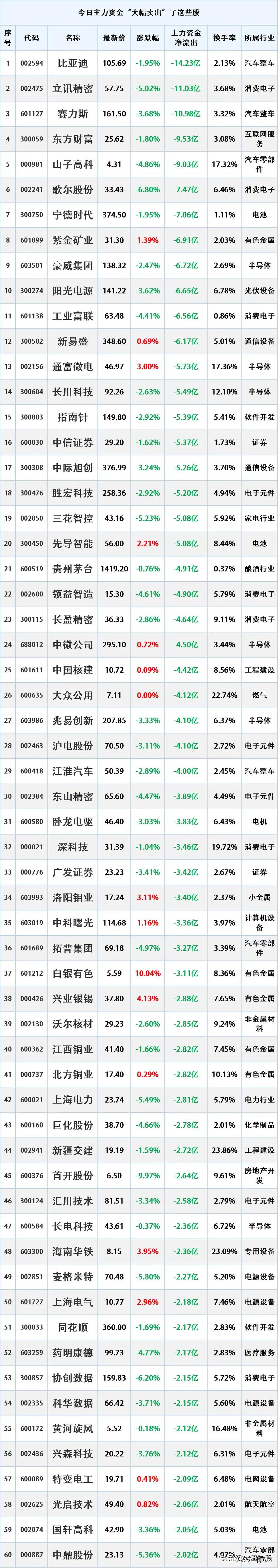 尾盘出逃,10月13日主力资金大幅流出的股票名单。 资金流出是指在一定时期内(如一天、一周等),主动卖出某只股票的资金量大于主动买入该股票的资金量。主动卖出是指投资者以买方的报价直接成交,显示出投资者对该股票的消极持有或抛售意愿。