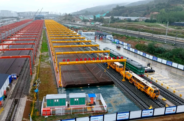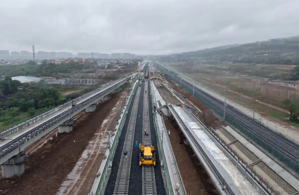 该工程桥隧比高达94%,地质条件复杂,施工难度大。为克服挑战,项目采用我国自主研发的新型铺轨设备和智能化管理系统,包括智能群吊与轨道工程运输管理智控平台,实现铺轨作业的数字化与精准化管理,有力提升施工效率与安全控制水平。