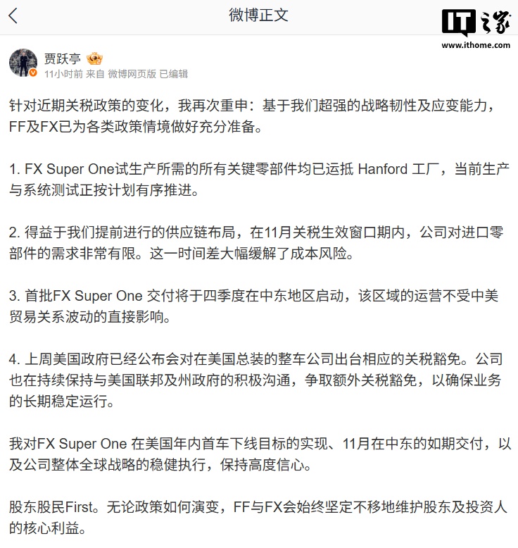 IT之家10月13日消息,法拉第未来创始人、联席CEO贾跃亭今日公布法拉第未来FXSuperOne车型相关进展,该车于7月18日发布。贾跃亭称:“基于我们超强的战略韧性及应变能力,FF及FX已为各类政策情境做好充分准备。”