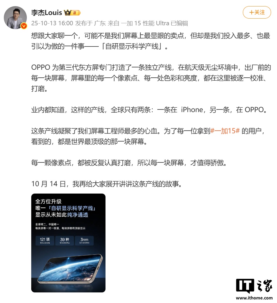 IT之家10月13日消息,一加中国区总裁李杰今天在微博解读了他们投入最多、也最引以为傲的“自研显示科学产线”。
