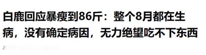31岁顶流白鹿太拼了!今年三部剧爆火入围,可新剧杀青宴上却自曝猛料,为角色瘦到86斤,身高165cm的她早破健康红线,查不出病因时连饭都吃不下、工作都没法做! 明明事业顺风顺水,为啥把自己逼到这份上? 她这现状,可给所有拼命打拼的年轻女性提了个大醒! 说起白鹿,不少人都觉得她的演艺路走得挺顺——网红出身,还当过MV女主,后来一步步成了能扛剧的大女主。 可谁能想到,这么风光的背后,她也曾被全网群嘲,那段日子难受到好像连呼吸都是错的。但偏偏她是个不服输的性子,别人越不看好,她越要做出成绩来,从剧里不起眼的背景板,硬生生拼到了主角位,这份转变真挺让人佩服的。 不过最近有个消息,把31岁白鹿的真实现状给曝了出来,看着真让人揪心,也给咱们所有年轻女性敲了个警钟。 咱们先聊聊大家都是怎么认识白鹿的吧? 是《招摇》里那个让三界都怕的女魔头路招摇,还是《凤囚凰》里一身正气的女将军霍璇? 这两个角色虽说火,但没真正让白鹿“出圈”,直到《周生如故》播出,她才算彻底被贴上“实力派”的标签。 她在《周生如故》里演的时宜,前期是娇俏灵动的名门姑娘,后期成了痛失爱人的悲情女子。尤其是“剔骨之刑”后的那场哭戏,没有夸张的动作,就只是眼眶泛红、嘴唇轻轻发抖,还有压抑着的呜咽声,可就是这些细微的动作,把那种心死的痛全传递到观众心里了。这部剧之后,大家才真正认可了“演员白鹿”。 入行这么多年,白鹿从来没说过“怕苦”“怕累”。为了演好《烈火军校》里的谢襄,她做了个让所有人意外的决定——把留了多年的长发剪了,就为了更贴合角色。 哪个二十多岁的姑娘不心疼自己的头发啊?可她为了角色,一点都没犹豫。 不光拍戏拼,录综艺的时候她也一样。这几年她是《奔跑吧》的常驻嘉宾,看过这档综艺的都知道,里面很多游戏要大量运动,特别耗体力。但只要导演喊“开始”,她立马就全身心投入进去,一点不含糊。 也正是这份执着,让白鹿的事业一路往上走。出道这么多年,她几乎每年都有高质量的作品出来,就没什么“空档期”。 今年上半年更是厉害,《白月梵星》《北上》《临江仙》三部剧接连播出,每部一开播就爆,霸屏了好几个月。更值得说的是,《北上》和《临江仙》还拿了不少大奖。可这份荣誉背后,是她无数个拼命的瞬间堆起来的。 不过最近白鹿的状态,却让人有点担心。10月10号,她的新剧《莫离》杀青了,就是这场杀青宴,让她的真实现状露了出来。 白鹿说,从7月份开始她就头疼,整个8月几乎都在治病,做了好多检查,可到现在都没查出具体原因。严重的时候饭都吃不下,连工作都没法进行。虽然现在她身体恢复了,但这场怪病,其实早有预兆。 为了贴合《莫离》里乱世孤女叶璃的“破碎感”,白鹿在四个月里硬生生瘦了十几斤,体重降到了86斤。她身高165厘米,这个体重早就跌破健康红线了,可这种挑战对她来说,好像成了“家常便饭”。 现在的白鹿是新生代顶流小花,拥有的财富和名气是普通人比不了的,可钱再多,在病魔面前也没用。她的现状,真该给所有年轻女性提个醒。 白鹿为角色付出的热情值得肯定,但真正的成功,从来不是靠盲目透支身体换来的。她的故事,既是励志的榜样,也是一次温柔的提醒,能让我们走得更远的,从来不是一时的“破釜沉舟”,而是以健康为基础的长久坚持。 咱们这些普通人打拼也一样,别光顾着忙工作,忘了身体才是本钱,你说是不是这个理儿?