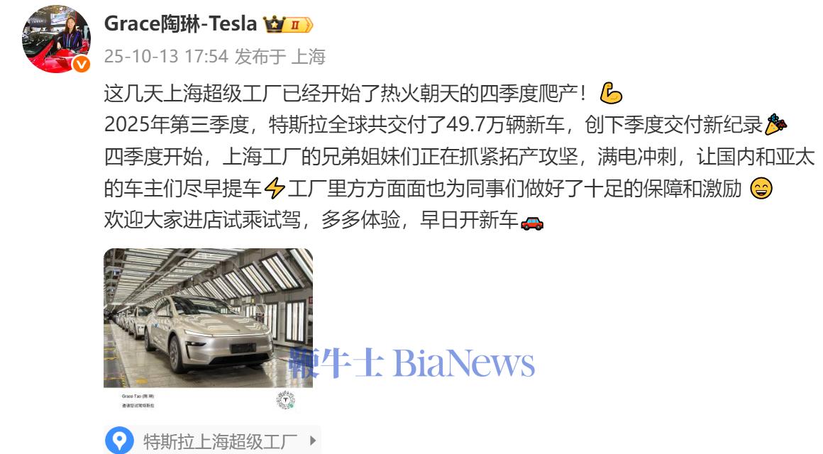 2025第三季度,特斯拉全球共交付49.7万辆新车,创下季度交付新纪录。