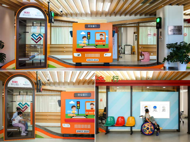 公益空间位于儿童康复楼二楼公共区域,改造面积约182平方米。该区域每日为超过200人次的孤独症、唐氏综合征、脑瘫等特殊儿童提供康复训练服务。基于特殊儿童感知与行为特点,项目特邀同济大学设计创意学院媒体传达系副主任梁靖副教授,带领硕士生团队,联合院方康复专家,共同将“灰空间”变身为集多媒体互动教学与模拟交通实景于一体的多功能空间,旨在通过游戏化训练,有效提升特殊儿童危险识别与社交适应能力。