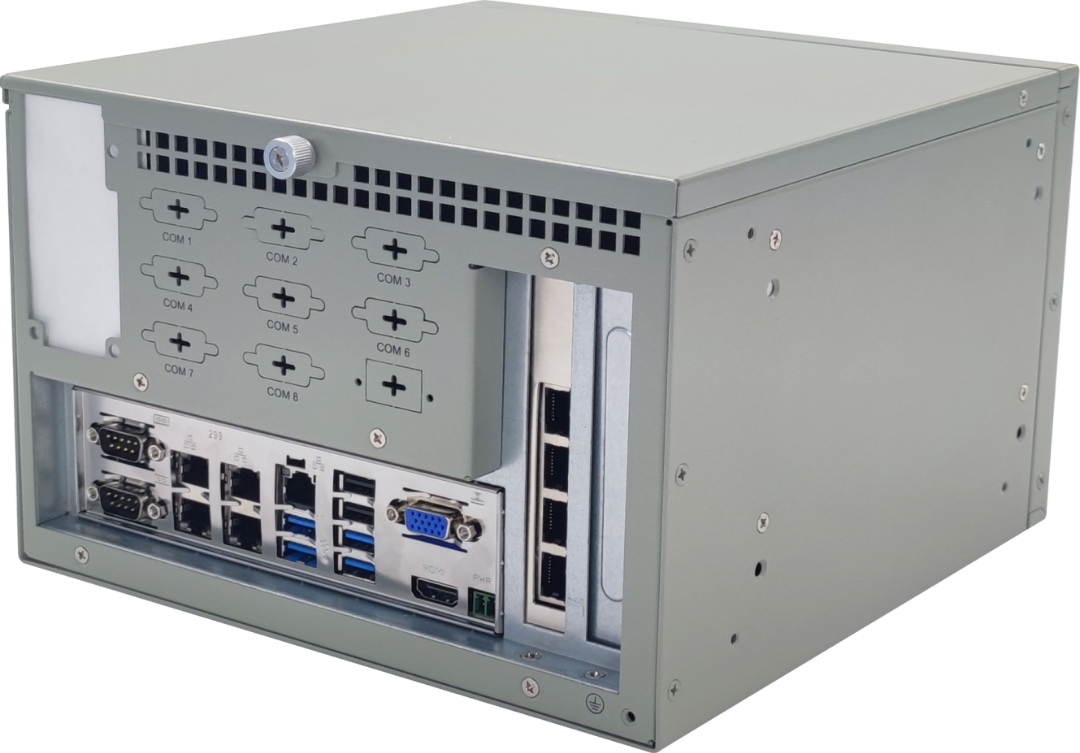 推荐配置方案:PCIe槽插入4口PoE网卡,驱动多相机同步采集;扩展8个COM口连接PLC控制剔除装置。