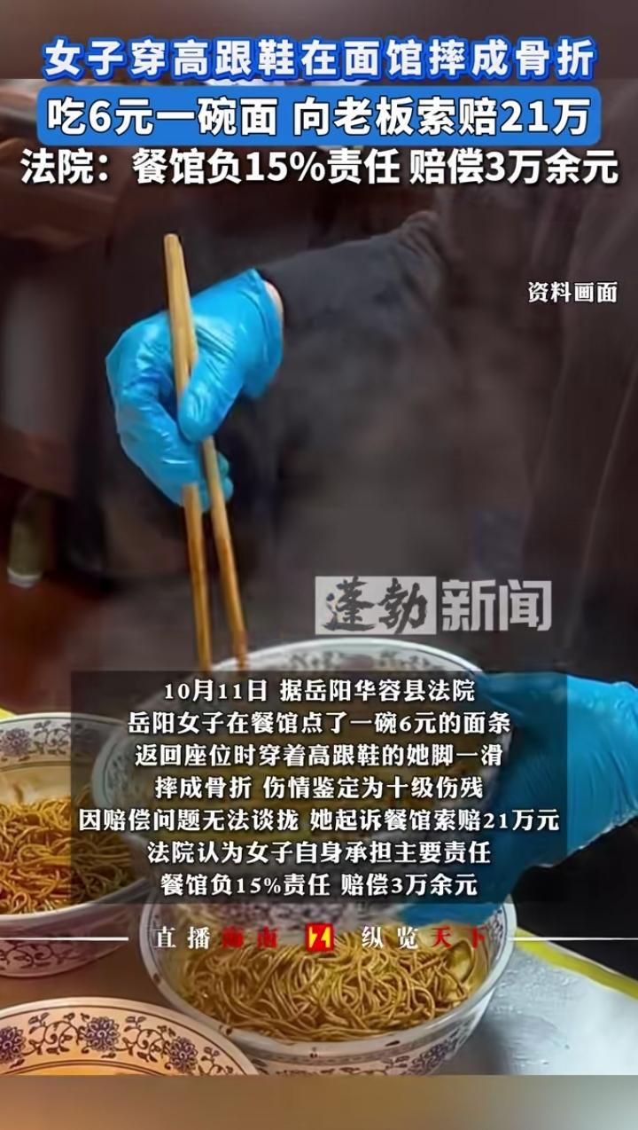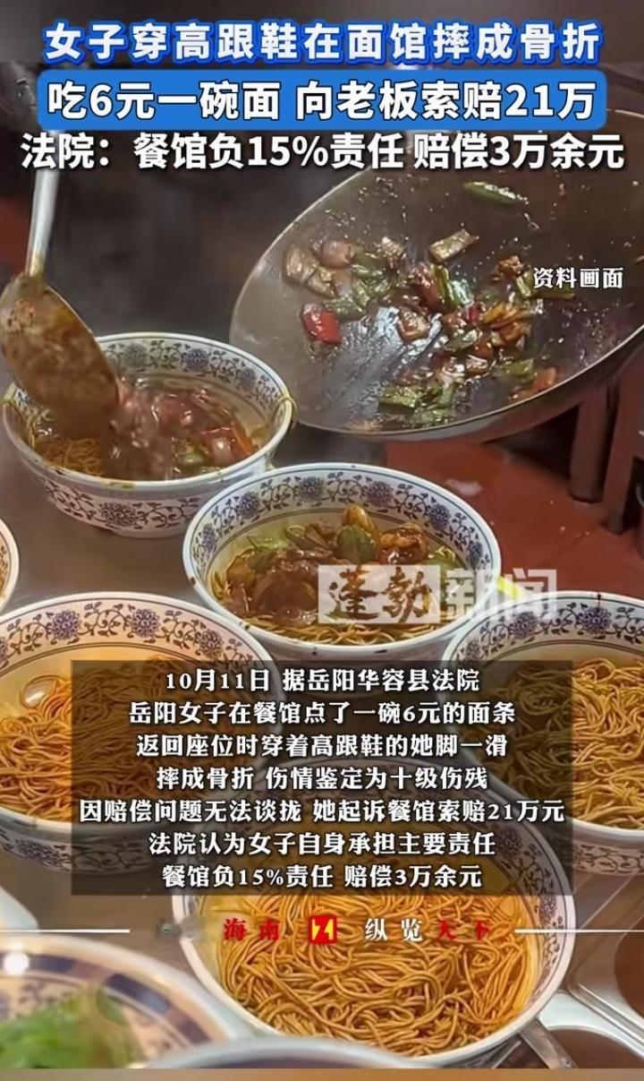 近日湖南岳阳,一35岁女子来到一家面馆,点了一碗6元的面条,谁料,在回到座位的时候意外摔倒了,女子接下来的操作让老板傻眼了! 女子摔倒后,摔的比较严重,送医院就医后,女子向面馆老板索赔21万元,老板不同意,双方闹到法庭,经过法庭判决,女子摔倒女自己负主要责任85%,面馆属于次要责任15%,所以最终判定面馆赔女子3万元医疗费!