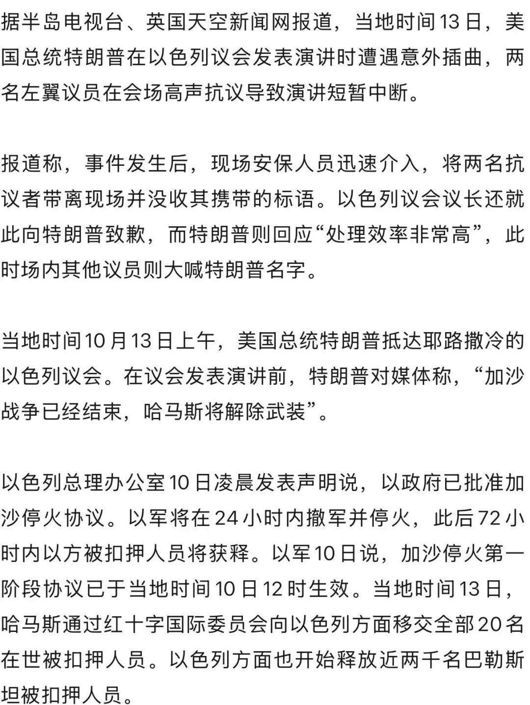 外媒:特朗普在以色列议会演讲被打断,两名抗议者被安保强制带离